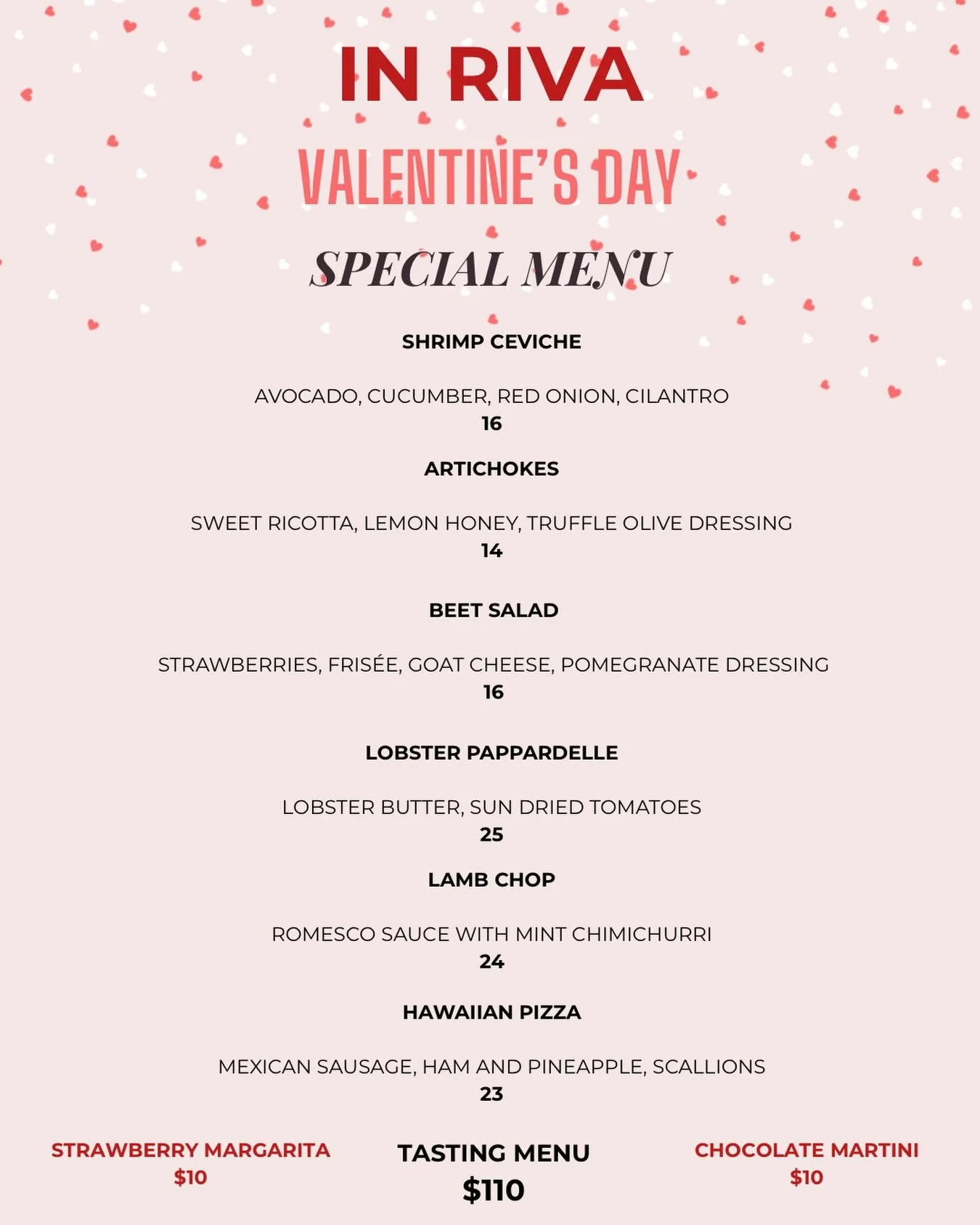 We welcome you to celebrate Valentine’s Day with us at In Riva! We will be offering a one-of-a-kind menu in addition to our regular menu.